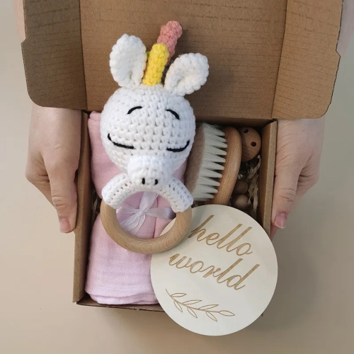 Set bebelusi, Nou Nscuti, Hello World , 6 piese, lantisor suzeta, jucarie interactiva, Unicorn crosetat