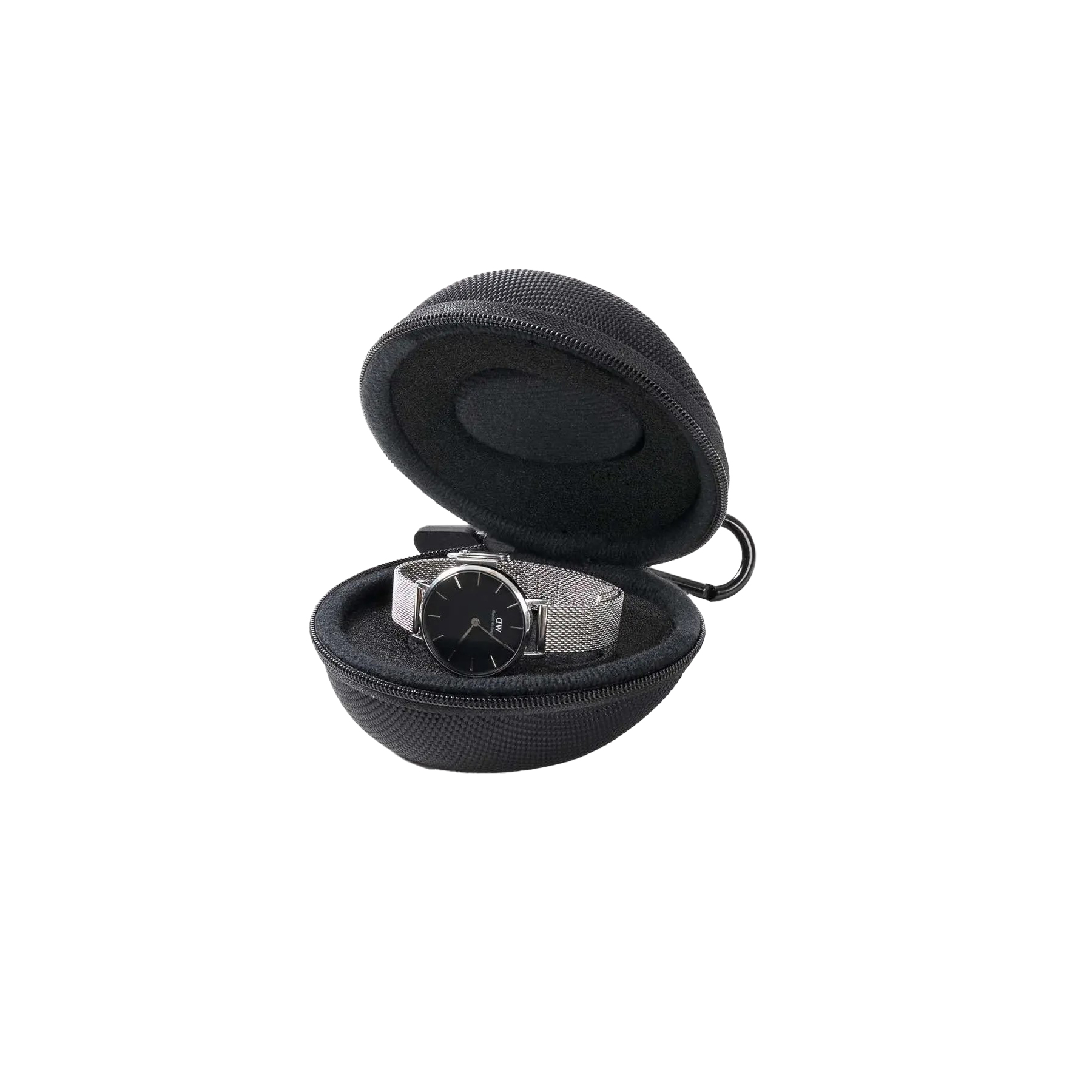 Cutie de protectie pentru pastrarea si protejarea ceasului, conceputa cu atentie si grija pentru a satisface nevoile de organizare si siguranta.Forma si captuseala din interior protejeaza impotriva socurilor, prafului si zgarieturilor, fermoarul faciliteaza accesul iar carabina de prindere permite atasarea carcasei la bagaj in calatorii sau la rucsac.