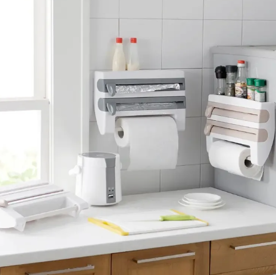 Dispenser de bucatarie pentru folie alimentara, folie de aluminiu si prosoape de hartie, Alb Gri