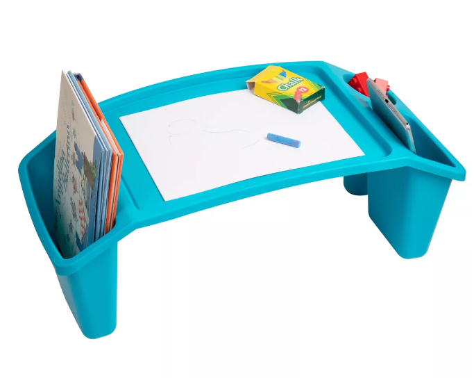 Transformati activitatile zilnice ale copilului dumneavoastra intr-o experienta comoda si placuta cu aceasta masuta din plastic de culoare albastru. Proiectata pentru a fi asezata deasupra picioarelor copilului atunci cand acesta sta, masuta ofera o suprafata generoasa de 35x27 cm, perfecta pentru scris, desenat, citit sau chiar pentru servirea mesei. Dotata cu laturi functionale, masuta dispune de cutii de depozitare de 24x9x17 cm si 15,5x9x27 cm, ideale pentru creioane, jucarii sau alte accesorii, precum si un suport circular cu diametrul de 8 cm pentru pahar sau sticla. Versatila si practica, masuta poate fi utilizata atat pe pat, pe canapea, cat si pe podea, adaptandu-se usor nevoilor copilului in diverse contexte. Cu dimensiuni totale de 59,5x30,3x21,1 cm, aceasta masuta multifunctionala este un accesoriu esential pentru orice copil activ si creativ.