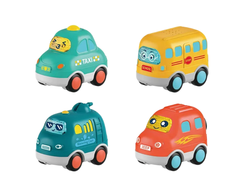 Setul de 4 masinute sunt concepute pentru a oferi distractie sigura si fiabila pentru copii cu varsta de 12 luni si peste. Fiecare vehuicul prezinta modele vibrante multicolore care capteaza atentia si imaginatia celor mici. Realizate cu accent pe siguranta, aceste jucarii sunt realizate din materiale de inalta calitate pentru a asigura durabilitate si timp de joaca de lunga durata. Fiecare masinuta are un design prietenos pentru copii, culori vibrante, cu margini netede si vopsea non-toxica. Promoveaza abilitatile motorii fine pe masura ce bebelusii apuca si se joaca cu masinutele. Acestea au un design compact si sunt usoare pentru manipulare facila.