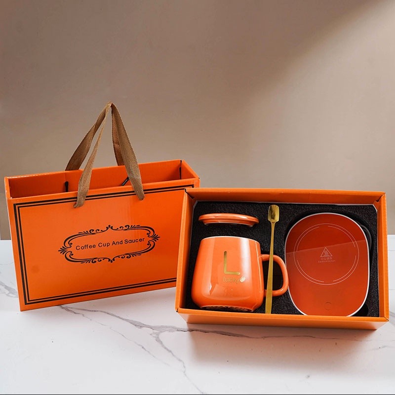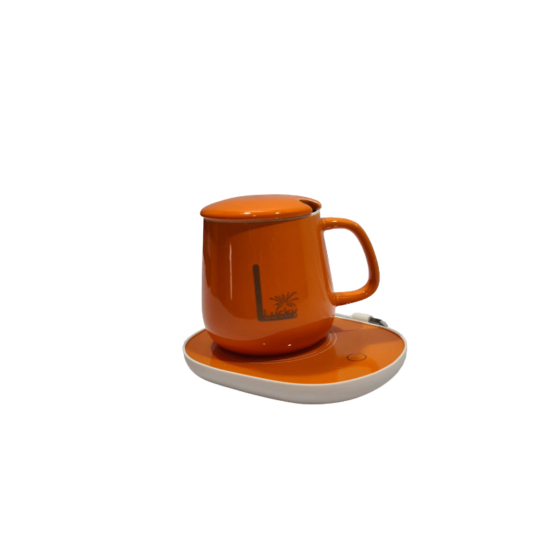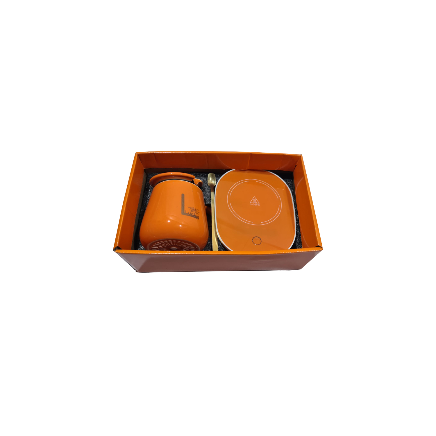 Set cadou cana ceramica cu baza incalzitor cu inductie,suport cu incalzire smart, buton touch, functie auto-oprire, capacitate 400 ml, Portocaliu